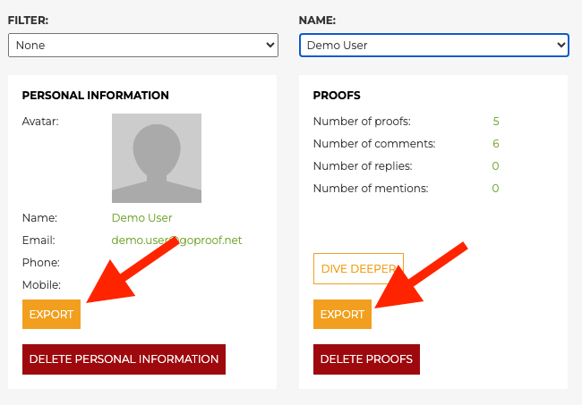 From here, you can export their Personal Information and or Proof information by clicking on the appropriate Export buttons. A zip file will be generated and downloaded to your computer to share with the requester.